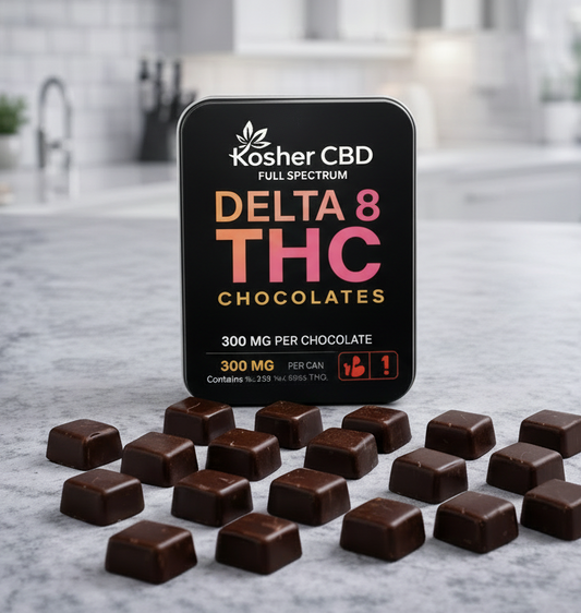 Delta 8 THC is a naturally occurring cannabinoid found in small traces in hemp plants. Our delta 8 products contain concentrated delta 8 THC extracted from the pesticide-free cannabis flower grown by Kosher CBDs. Delta 8 is an analog of delta 9 THC, meaning it provides similar therapeutic effects and benefits such as helping with pain, anxiety, nausea and sleep disorders. However, delta 8 does not produce the same level of psychoactive "high" as delta 9. Our full catalog of delta 8 products including gummies, vapes, tinctures and more are certified Kosher by reliable certification agencies. This Kosher certification verifies that all our delta 8 products comply with Jewish kosher dietary laws and regulations, meaning they can be safely consumed by those who keep Kosher.